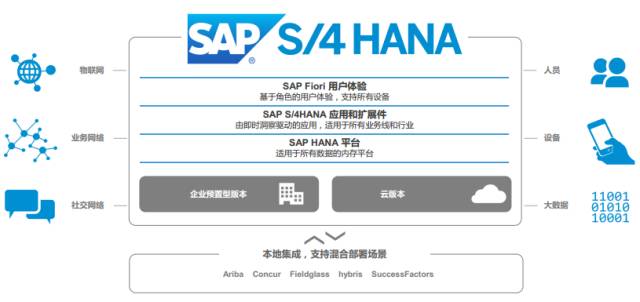 注:通俗理解,底层内存是HANA,快,系统是S4,极简,外表皮肤是Fiori,既漂亮又便捷。还能用于物联网、大数据分析、移动端使用等。