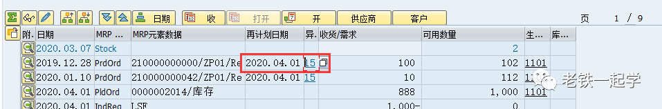 1、比如这个2019.12.28 PrdOrd 2100000000 的生产订单,可以看到其再计划日期是2020.04.01,例外消息15: