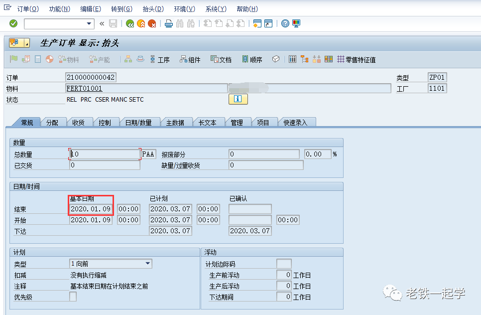看这个2020.01.09,PrdOrd 生产订单号是210000000042的数据,双击它,然后选择显示,我们可以看到这个生产订单的详细日期,其基本完成日期就是2020.01.09,如下图4: