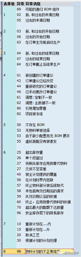 SAP将例外消息分成了8个组(注意69没有给分组),