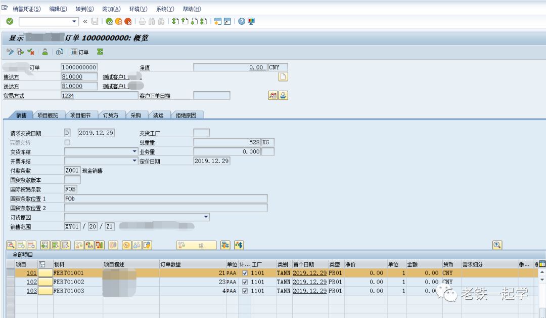 再看这个2019.12.29的CusOrd 1000000000/000101的销售订单需求,同样双击它,然后选择显示,我们可以看到一个销售订单,其中Fert01001的需求日期是2019.12.29,如下图3: