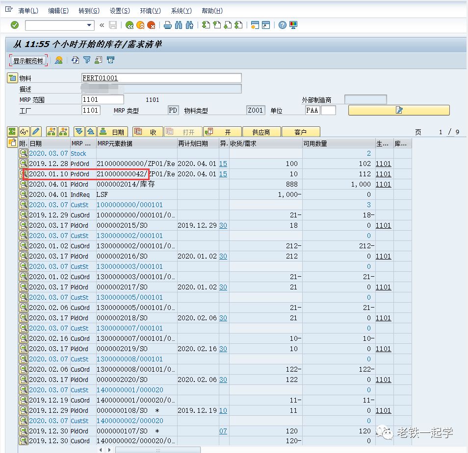 再返回到MD04,我们会发现,这个 210000000042生产订单,现在在日期列的内容就变成了2020.01.10,如下图7:
