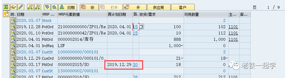 2、比如这个2020.03.17 PldOrd 0000002015/SO的计划订单,可以看到其再计划日期是2019.12.29,例外消息30: