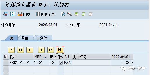 看这个 2020.04.01的IndReq的计划独立需求,我们双击它,然后选择显示,我们可以看到Fert01001的一条计划独立需求,其需求日期就是2020.04.01,如下图2: