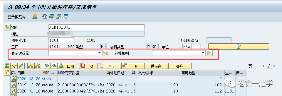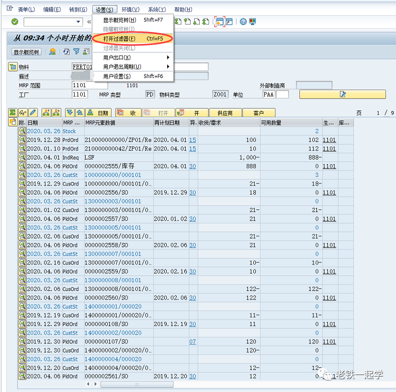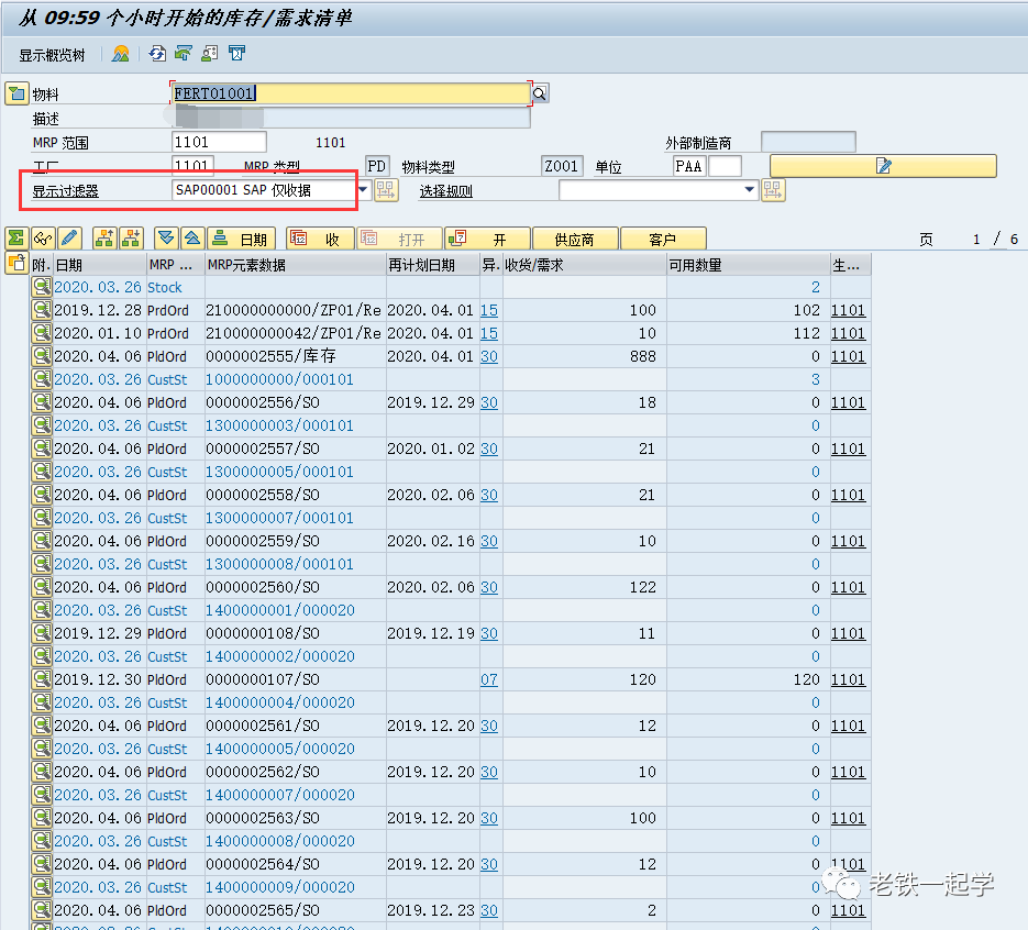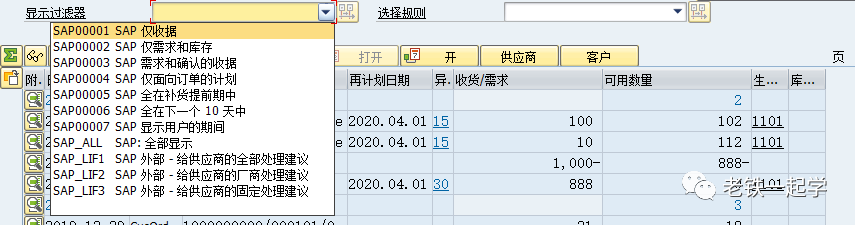 我们什么时候会用到这个过滤器呢?当一个物料在MD04中对应的MRP元素特别多的时候,或者你只想看某一类的MRP元素的数据的时候,就可以通过设置过滤器来显示需要的数据。