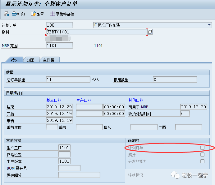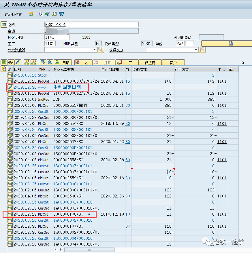 我们看到,在MD04中多了一行数据:手工固定日期,并且2019.12.29的这个计划订单后面带了*(说明被固定了),如果需求发生变化,再运行MRP,这个计划订单就不会发生变化了,但是计划订单并没有固定标识:
