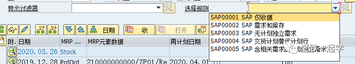 但显示过滤器设置了“仅收货”,我们可以看到MD04中只有库存、计划订单、生产订单等MRP元素是供货的数据,并且再计划日期、可用数量没有发生任何变化,只是过滤掉其他数据。再看选择规则: