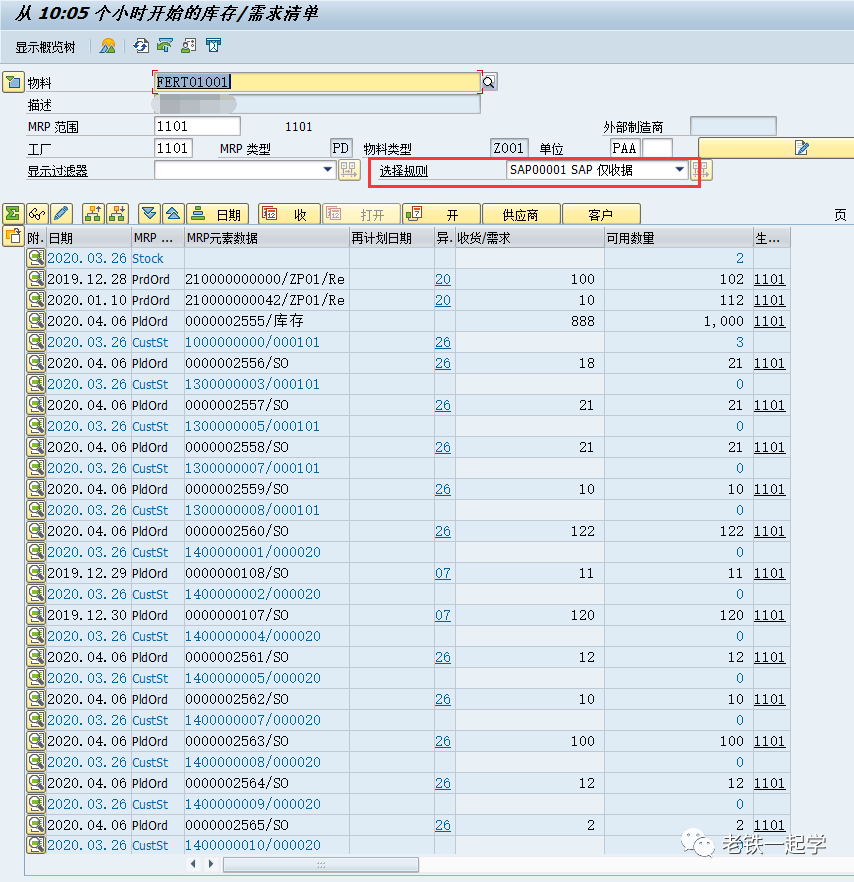 当在选择规则设置了“仅收货”,同样MD04中只出现了MRP元素是收货的数据,但是大家可以发现,再计划日期没有了,而且可用数量也发生了变化。所以他们的区别是:显示过滤,仅仅是把其他数据过滤不显示,但还会影响显示出来的数据;选择规则,则是按选择的过滤条件重新显示所选择的数据,没有选择的数据不会影响所选择的数据。