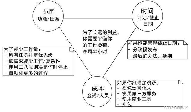 上图所示为项目管理三角,并且加了一些额外的说明以帮助记忆这些应对策略。首先,需要接受的事实是项目管理是一个关于权衡的艺术,花更多的时间和金钱却做更少的事情。当你用这种方式思考工作的时候,就会发现一些其他的办法去平衡项目而不是加班加点。