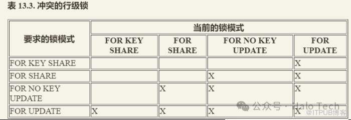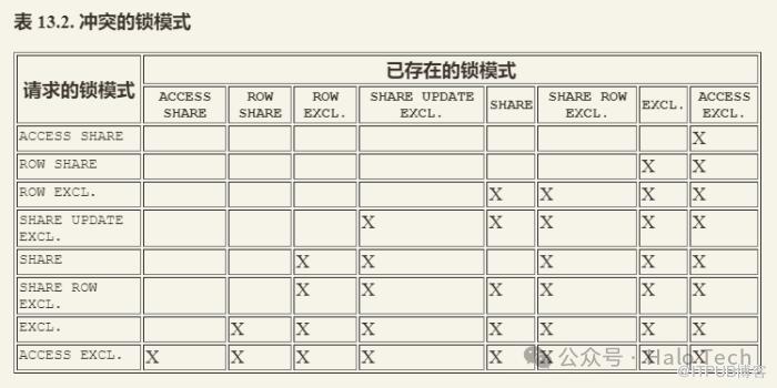 下表13.2冲突的锁模式