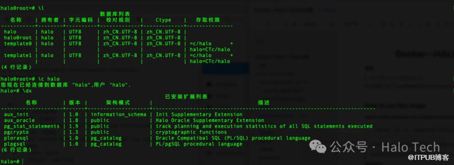 在连接到数据之后使用 \c halo 可以连接到halo数据库,然后用\dx可以看到halo数据库已经安装了oracle扩展。