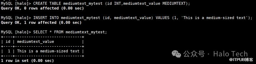 CREATE TABLE mediumtext_mytest (id INT,mediumtext_value MEDIUMTEXT);INSERT INTO mediumtext_mytest (id, mediumtext_value) VALUES (1, 'This is a medium-sized text');SELECT * FROM mediumtext_mytest;