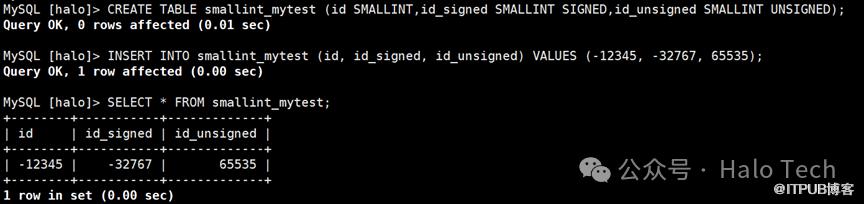 CREATE TABLE smallint_mytest (id SMALLINT,id_signed SMALLINT SIGNED,id_unsigned SMALLINT UNSIGNED);INSERT INTO smallint_mytest (id, id_signed, id_unsigned) VALUES (-12345, -32767, 65535);SELECT * FROM smallint_mytest;