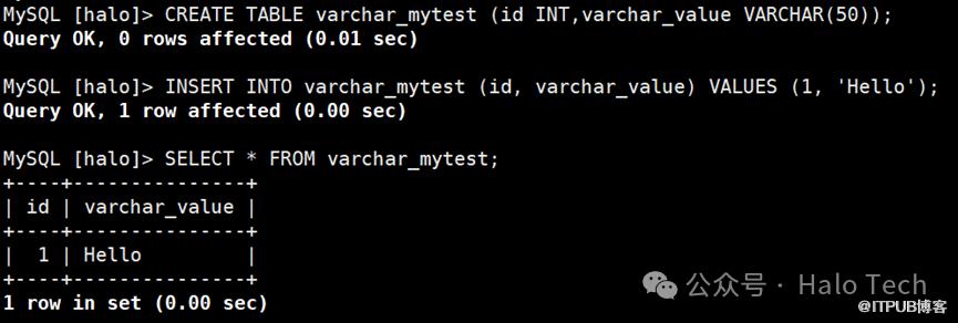 CREATE TABLE varchar_mytest (id INT,varchar_value VARCHAR(50));INSERT INTO varchar_mytest (id, varchar_value) VALUES (1, 'Hello');SELECT * FROM varchar_mytest;