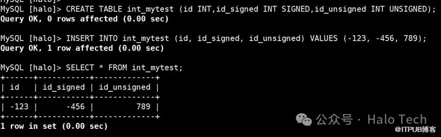 CREATE TABLE int_mytest (id INT,id_signed INT SIGNED,id_unsigned INT UNSIGNED);INSERT INTO int_mytest (id, id_signed, id_unsigned) VALUES (-123, -456, 789);SELECT * FROM int_mytest;