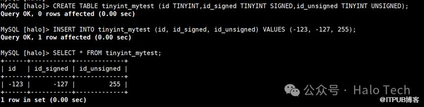 CREATE TABLE tinyint_mytest (id TINYINT,id_signed TINYINT SIGNED,id_unsigned TINYINT UNSIGNED);INSERT INTO tinyint_mytest (id, id_signed, id_unsigned) VALUES (-123, -127, 255);SELECT * FROM tinyint_mytest;