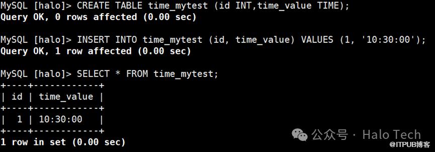 CREATE TABLE time_mytest (id INT,time_value TIME);INSERT INTO time_mytest (id, time_value) VALUES (1, '10:30:00');SELECT * FROM time_mytest;