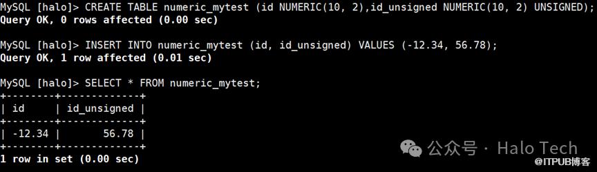 CREATE TABLE numeric_mytest (id NUMERIC(10, 2),id_unsigned NUMERIC(10, 2) UNSIGNED);INSERT INTO numeric_mytest (id, id_unsigned) VALUES (-12.34, 56.78);SELECT * FROM numeric_mytest;