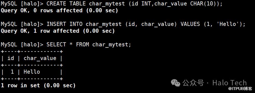 CREATE TABLE char_mytest (id INT,char_value CHAR(10));INSERT INTO char_mytest (id, char_value) VALUES (1, 'Hello');SELECT * FROM char_mytest;
