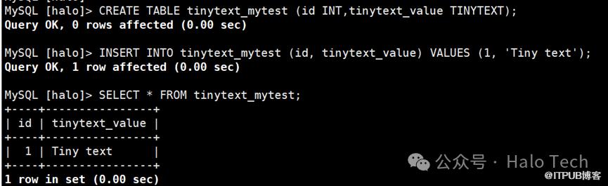 CREATE TABLE tinytext_mytest (id INT,tinytext_value TINYTEXT);INSERT INTO tinytext_mytest (id, tinytext_value) VALUES (1, 'Tiny text');SELECT * FROM tinytext_mytest;