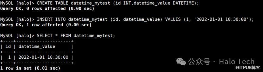 CREATE TABLE datetime_mytest (id INT,datetime_value DATETIME);INSERT INTO datetime_mytest (id, datetime_value) VALUES (1, '2022-01-01 10:30:00');SELECT * FROM datetime_mytest;