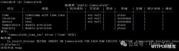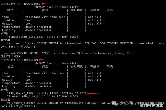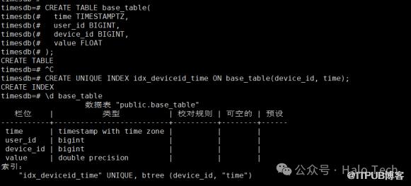 \d timescaletbCREATE UNIQUE INDEX idx_device_time ON timescaletb(device, time);\d timescaletb