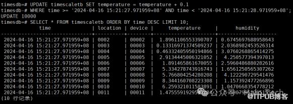 UPDATE timescaletb SET temperature = temperature + 0.1WHERE time >= '2024-04-16 15:21:27.971959+08' AND time < '2024-04-16 15:21:28.971959+08';SELECT * FROM timescaletb ORDER BY time DESC LIMIT 10;