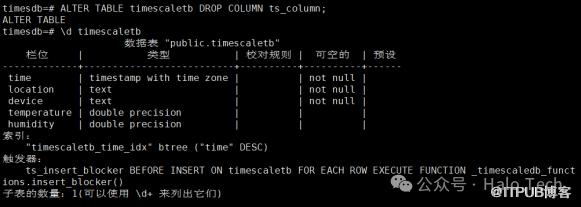 ALTER TABLE timescaletb DROP COLUMN ts_column;\d timescaletb