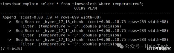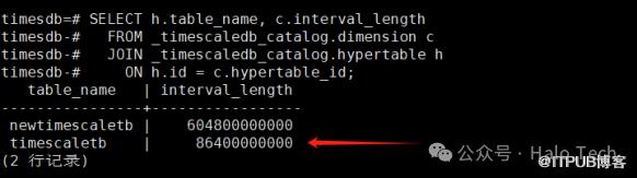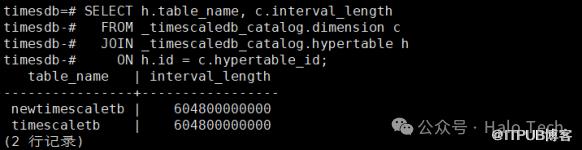 可以看到没有指定 chunk_time_interval 的Hypertable 分区间隔为 604800000000,通过计算 604800000000 / 1000 / 1000 / 60 / 60 / 24 = 7天,interval_length 的单位为微秒(microsecond)。