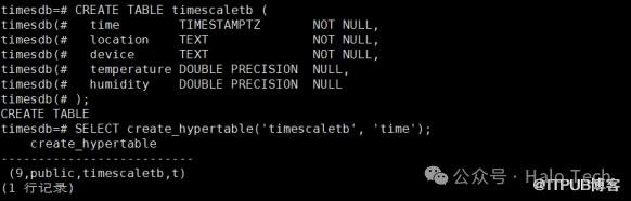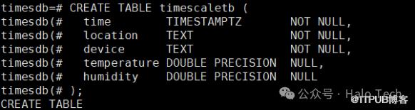 CREATE TABLE timescaletb (time TIMESTAMPTZ NOT NULL,location TEXT NOT NULL,device TEXT NOT NULL,temperature DOUBLE PRECISION NULL,humidity DOUBLE PRECISION NULL);SELECT create_hypertable('timescaletb', 'time');