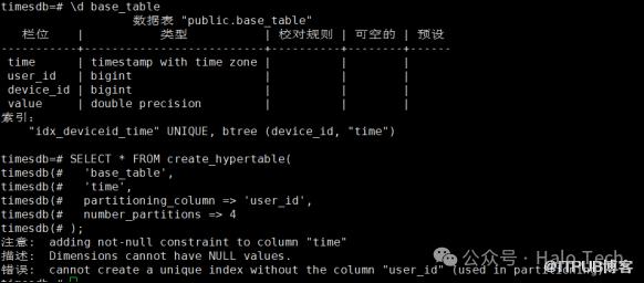 例如,在普通表 base_table 中已经在 device_id 和 time 列上建立了索引 idx_deviceid_time,那么创建以该表为基表的 hypertable 的分区列需要包含在索引列中,即分区列仅能为 time 与 device_id 的组合。