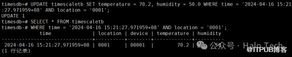 UPDATE timescaletb SET temperature = 70.2, humidity = 50.0 WHERE time = '2024-04-16 15:21:27.971959+08' AND location = '0001';SELECT * FROM timescaletb WHERE time = '2024-04-16 15:21:27.971959+08' AND location = '0001';
