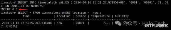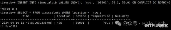 INSERT INTO timescaletb VALUES (NOW(), 'new', '00001', 70.1, 50.0) ON CONFLICT DO NOTHING;SELECT * FROM timescaletb WHERE location = 'new';