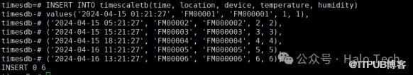 INSERT INTO timescaletb(time, location, device, temperature, humidity)values('2024-04-15 01:21:27', 'FM00001', 'FM000001', 1, 1),('2024-04-15 05:21:27', 'FM00002', 'FM000002', 2, 2),('2024-04-15 15:21:27', 'FM00003', 'FM000003', 3, 3),('2024-04-15 18:21:27', 'FM00004', 'FM000004', 4, 4),('2024-04-16 11:21:27', 'FM00005', 'FM000005', 5, 5),('2024-04-16 13:21:27', 'FM00006', 'FM000006', 6, 6);