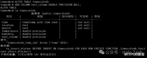 ALTER TABLE timescaletb ADD COLUMN test_column DOUBLE PRECISION NULL;\d timescaletb