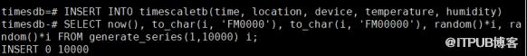 INSERT INTO timescaletb(time, location, device, temperature, humidity)SELECT now(), to_char(i, 'FM0000'), to_char(i, 'FM00000'), random()*i, random()*i FROM generate_series(1,10000) i;