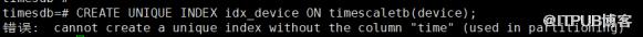 idx_device_time 索引中包含了所有分区列 time,而 device 不是分区列,如果创建的索引组合不包含分区列,会抛出错误,如下 idx_device 索引仅建立在 device 列上