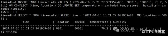INSERT INTO timescaletb VALUES ('2024-04-16 15:21:27.971959+08', '0001', '00001', 70.2, 50.1) ON CONFLICT (time, location) DO UPDATE SET temperature = excluded.temperature, humidity = excluded.humidity;SELECT * FROM timescaletb WHERE time = '2024-04-16 15:21:27.971959+08' AND location = '0001';