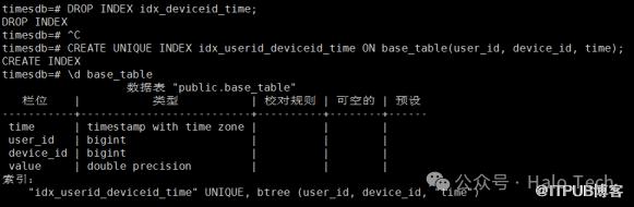 DROP INDEX idx_deviceid_time;CREATE UNIQUE INDEX idx_userid_deviceid_time ON base_table(user_id, device_id, time);\d base_table