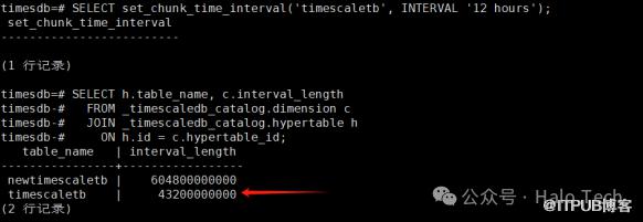 SELECT set_chunk_time_interval('timescaletb', INTERVAL '12 hours');SELECT h.table_name, c.interval_lengthFROM _timescaledb_catalog.dimension cJOIN _timescaledb_catalog.hypertable hON h.id = c.hypertable_id;