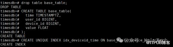 drop table base_table;CREATE TABLE base_table(time TIMESTAMPTZ,user_id BIGINT,device_id BIGINT,value FLOAT);CREATE UNIQUE INDEX idx_deviceid_time ON base_table(device_id, time);