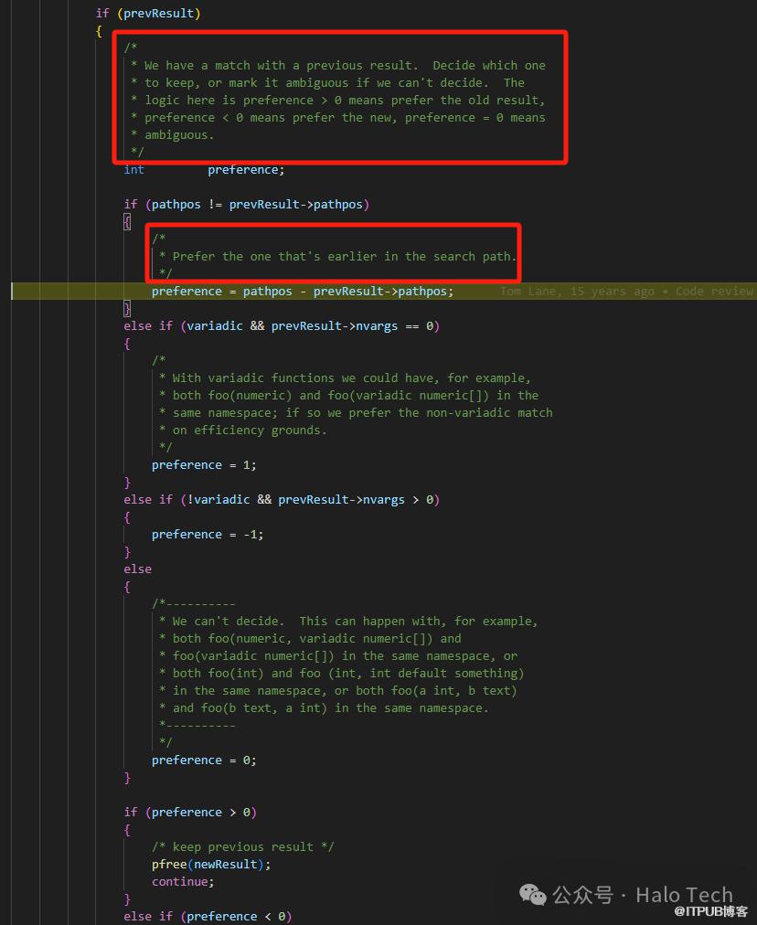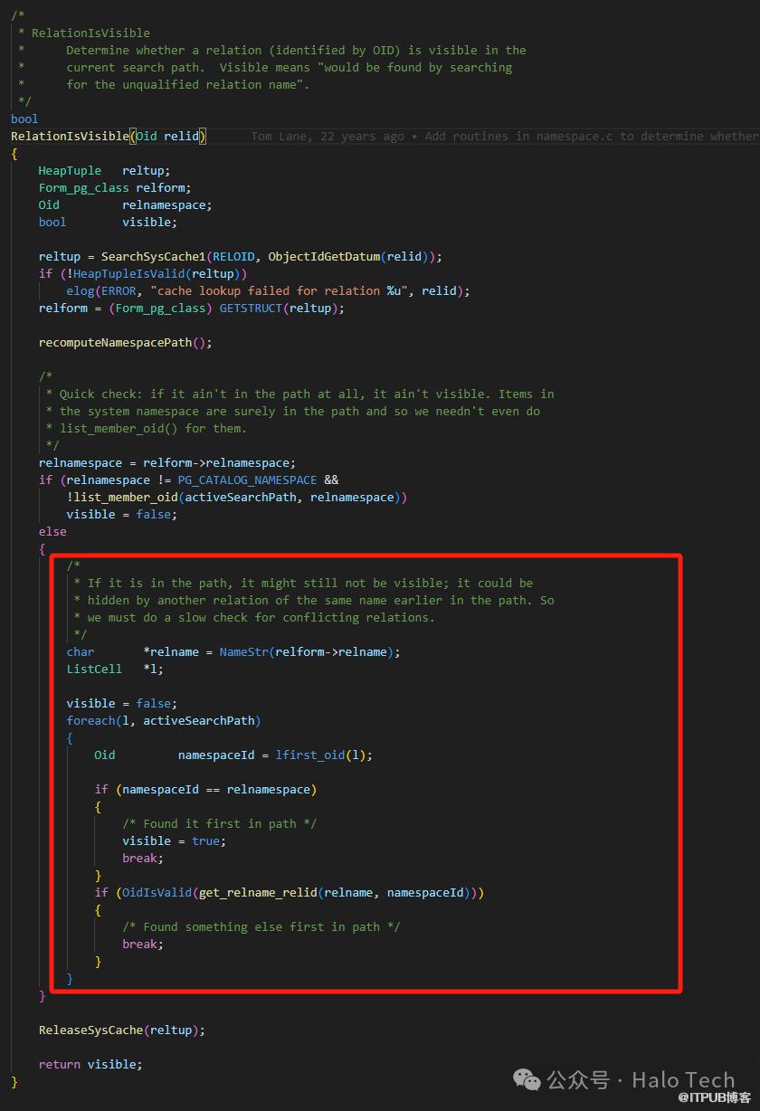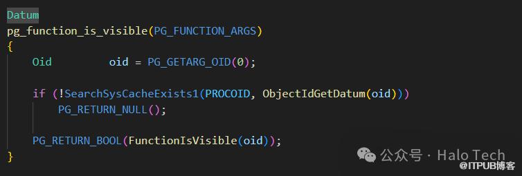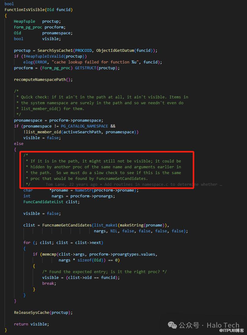 果不其然,schema_b.func()被隐藏了,为当前上下文不可见状态。都看到这了,干脆再翻一翻代码看看,这里面到底是怎么处理的。找到pg_function_is_visible对应的内部函数pg_function_is_visible