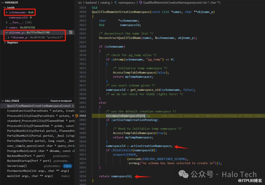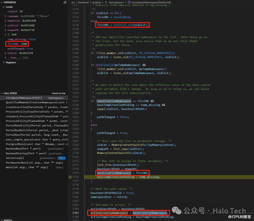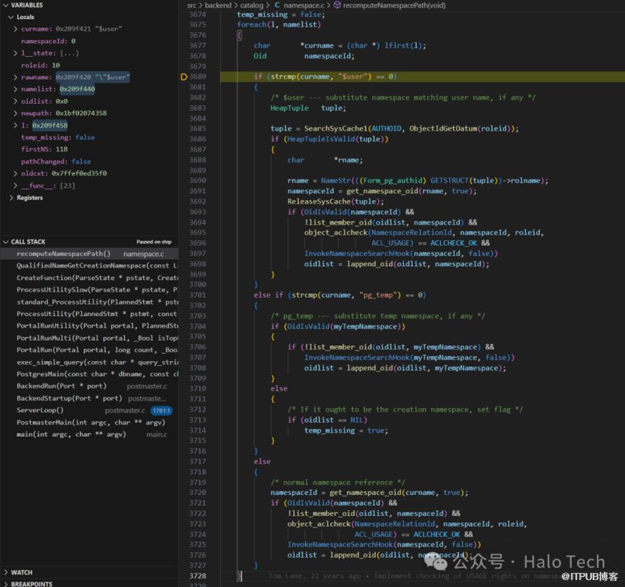由于此次baseSearchPathValid置为了true,当search_path没有发生变化的时候,将不再执行这些操作,直接获取这个activeCreationNamespace即可。如果你也想这样子调试的话,需要注意一下。
