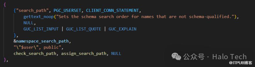 在src/backend/utils/misc/guc_tables.c 我们可以看见这麽一段,所以在外部是search_path,在内部为namespace_search_path