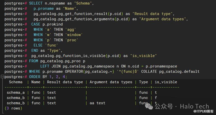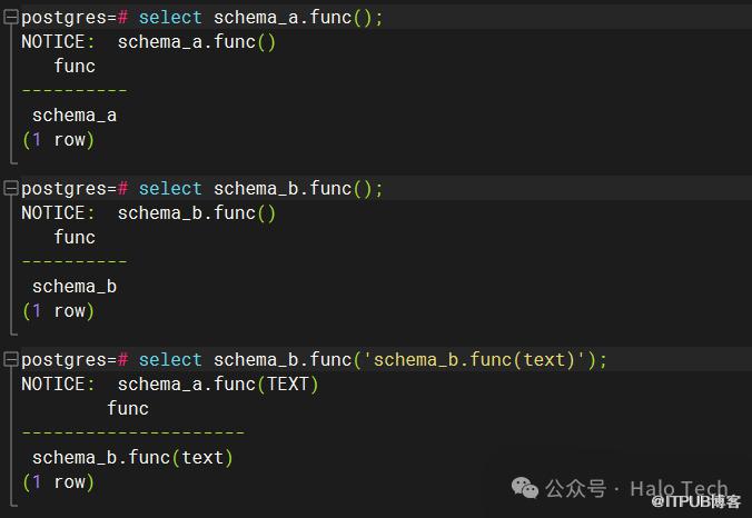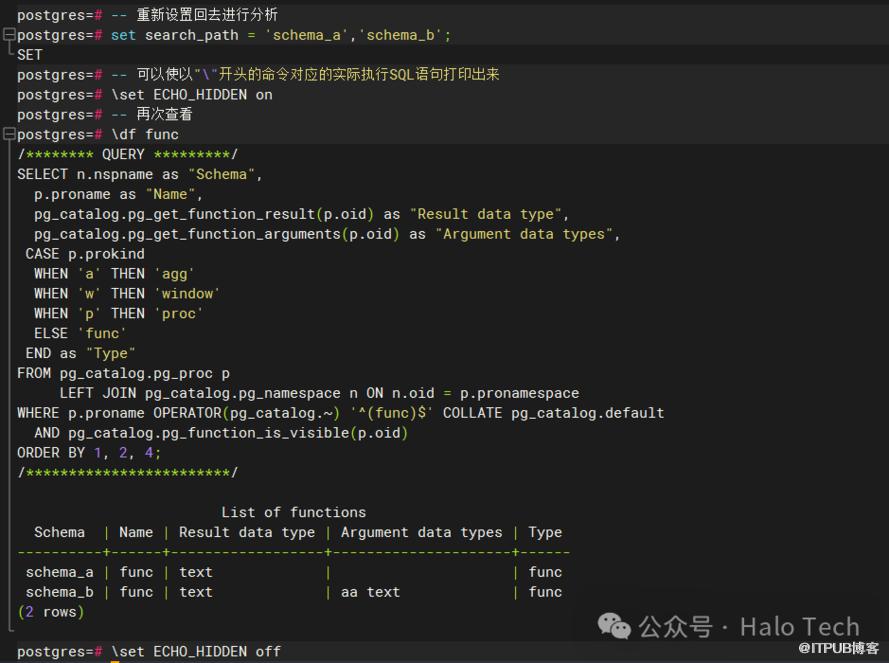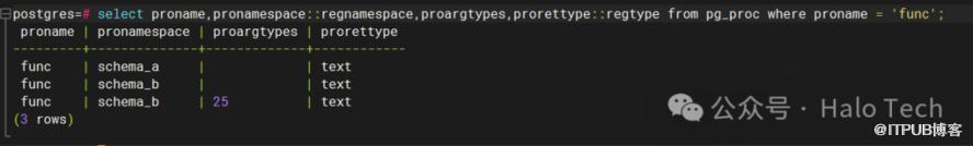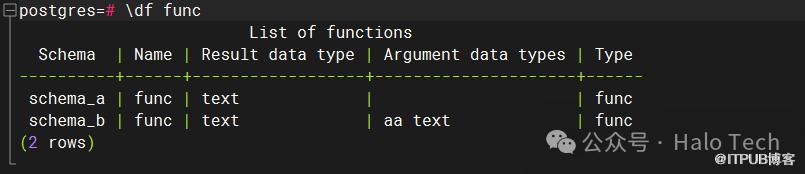 好了,不卖关子了,谜底揭晓。如果此时使用\df func查询,最终出来将会是两条数据,分别是schema_a.func()和schema_b.func(aa text),实际运行如下图所示