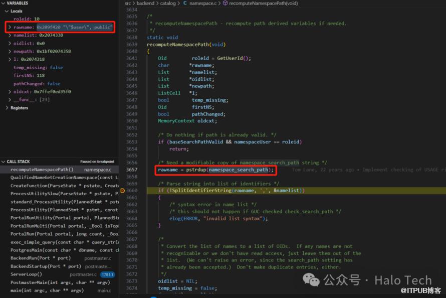 接着查看recomputeNamespacePath ,开头就看见熟悉的身影,这个rawname拷贝了namespace_search_path,然后按","分割存储在namelist中,而他的数据又是那么亲切,那么有没有一种可能它就是search_path在内部的表现,所以先查看下namespace_search_path