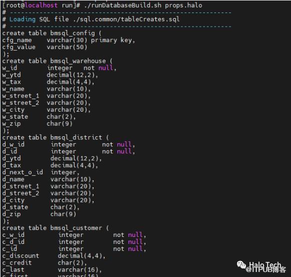 [root@localhost run]# ./runDatabaseDestroy.sh props.halo# ------------------------------------------------------------# Loading SQL file ./sql.common/tableDrops.sql# ------------------------------------------------------------drop table bmsql_config;drop table bmsql_new_order;drop table bmsql_order_line;drop table bmsql_oorder;drop table bmsql_history;drop table bmsql_customer;drop table bmsql_stock;drop table bmsql_item;drop table bmsql_district;drop table bmsql_warehouse;drop sequence bmsql_hist_id_seq;