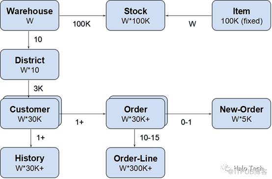 TPC-C模型是以一个在线零售业为例,设计的一种模型。具体架构如下所示: