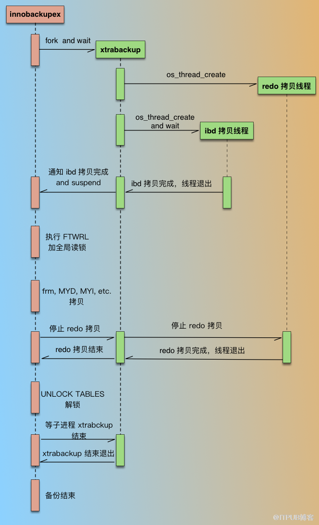 最后 innobackupex 和 xtrabackup 进程各自完成收尾工作,如资源的释放、写备份元数据信息等,innobackupex 等待 xtrabackup 子进程结束后退出。
