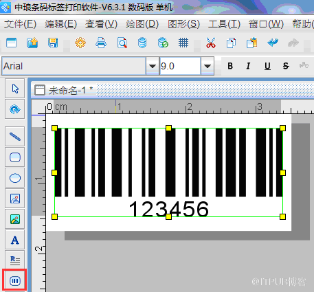 在条码生成器中新建一个空白标签,先在空白标签上添加一个普通条形码。然后把矩阵25码(Code 2 of 5 Matrix)的数据通过数据库批量导入软件中。